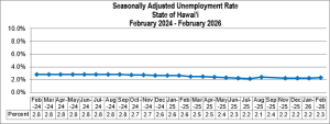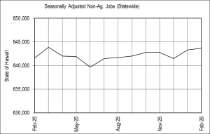 HONOLULU — The Hawai‘i State Department of Business, Economic Development and Tourism (DBEDT) today announced that the seasonally adjusted unemployment rate for February was 2.3 percent, compared to 2.2 percent in January. In February, 672,150 persons were employed and 15,650 were unemployed, for a total seasonally adjusted labor force of 687,850 statewide. Nationally, the seasonally adjusted unemployment rate was 4.4 percent in February, up from 4.3 percent in January.